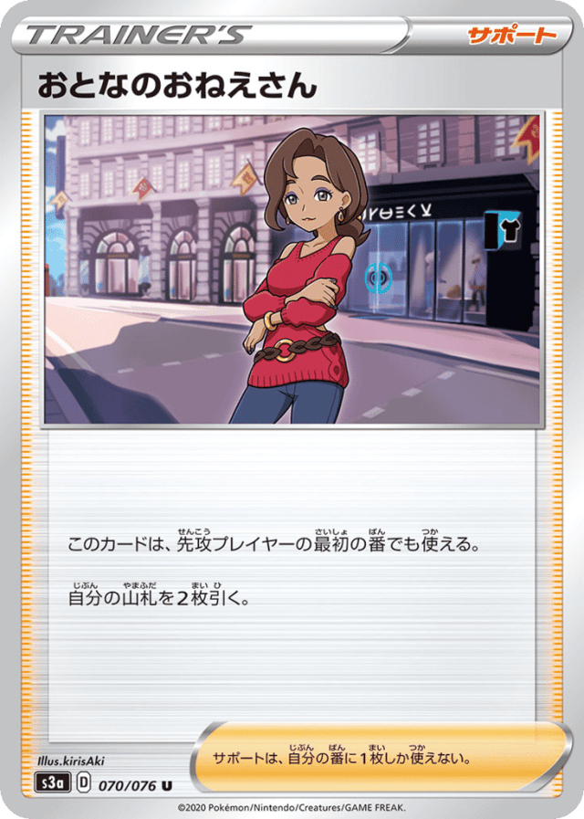 このカードは、先攻プレイヤーの最初の番でも使える。 自分の山札を2枚引く。 サポートは、自分の番に1枚しか使えない。