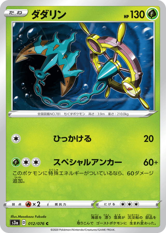 海底を 漂う 藻屑が 沈没船の 部品を 取りこんで ゴーストポケモンに 生まれ変わった。