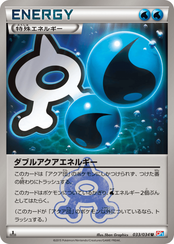 このカードは「アクア団」のポケモンにしかつけられず、つけた番の終わりにトラッシュする。 このカードはポケモンについているかぎり、Waterエネルギー2個ぶんとしてはたらく。 (このカードが「アクア団」のポケモン以外についているなら、トラッシュする。)
