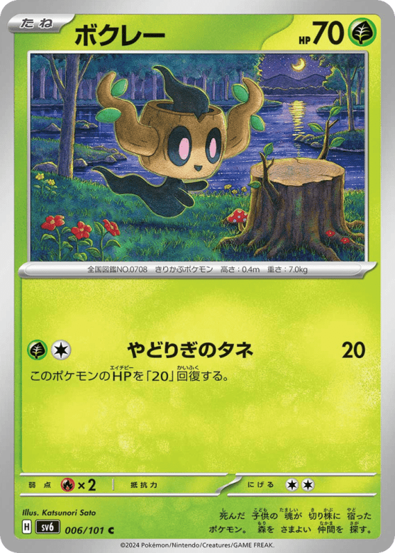 死んだ 子供の 魂が 切り株に 宿った ポケモン。 森を さまよい 仲間を 探す。