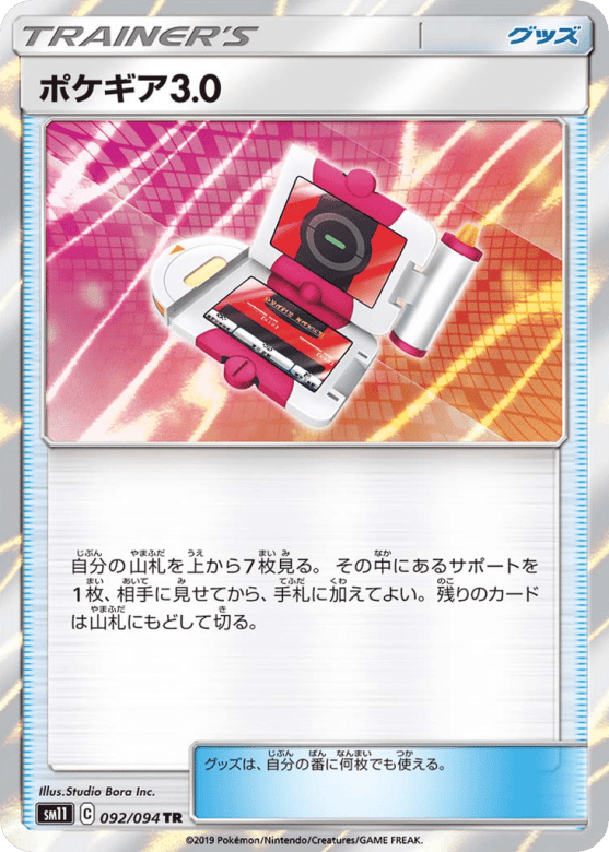 自分の山札を上から7枚見る。その中にあるサポートを1枚、相手に見せてから、手札に加えてよい。残りのカードは山札にもどして切る。 グッズは、自分の番に何枚でも使える。