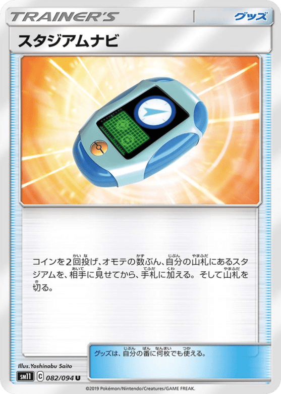 コインを2回投げ、オモテの数ぶん、自分の山札にあるスタジアムを、相手に見せてから、手札に加える。そして山札を切る。 グッズは、自分の番に何枚でも使える。
