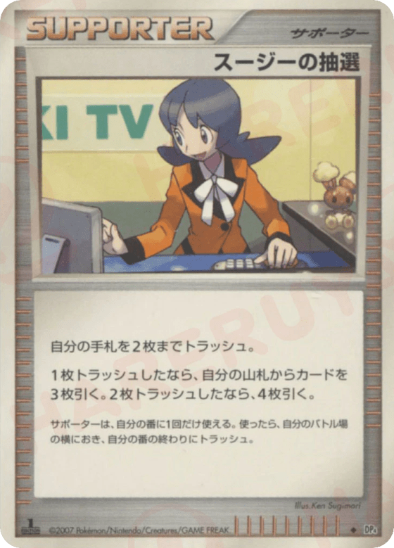 自分の手札を2枚までトラッシュ。<br> 1枚トラッシュしたなら、自分の山札からカードを3枚引く。2枚トラッシュしたなら、4枚引く。 サポートは、自分の番に1枚しか使えない。