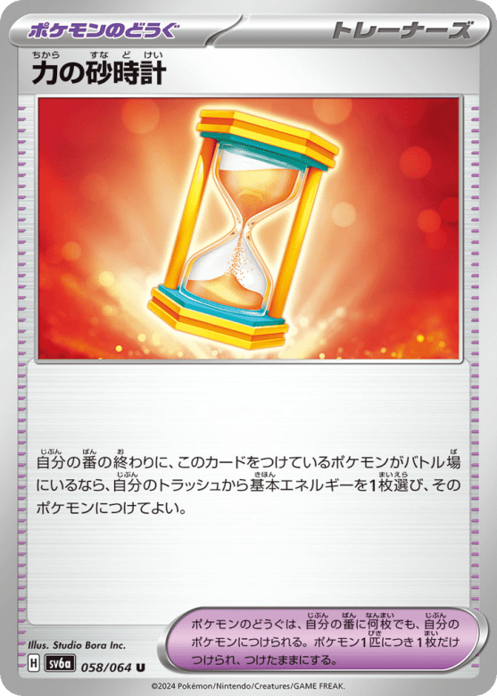 自分の番の終わりに、このカードをつけているポケモンがバトル場にいるなら、自分のトラッシュから基本エネルギーを1枚選び、そのポケモンにつけてよい。