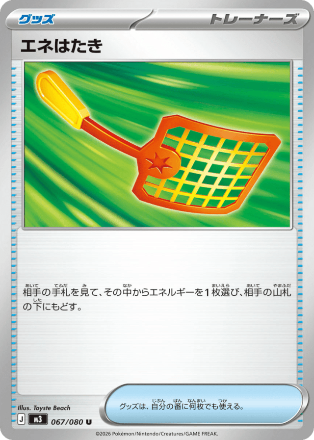 相手の手札を見て、その中からエネルギーを1枚選び、相手の山札の下にもどす。 グッズは、自分の番に何枚でも使える。
