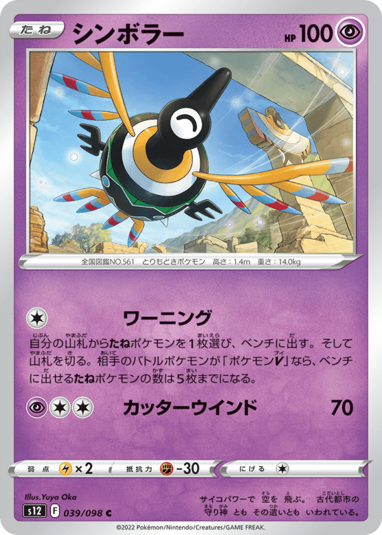 自分の山札からたねポケモンを1枚選び、ベンチに出す。そして山札を切る。相手のバトルポケモンが「ポケモンV」なら、ベンチに出せるたねポケモンの数は5枚までになる。