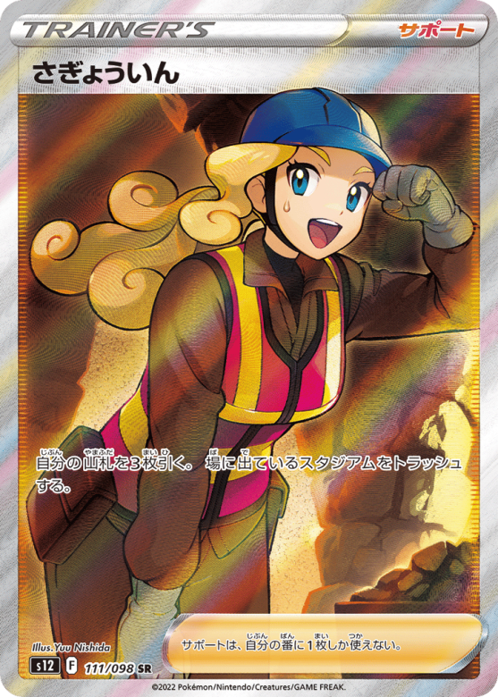 自分の山札を3枚引く。場に出ているスタジアムをトラッシュする。 サポートは、自分の番に1枚しか使えない。