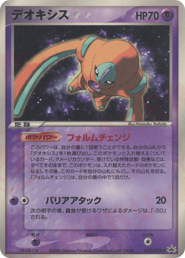 Once during your turn (before your attack), you may search your deck for another Deoxys and switch it with Deoxys. (Any cards attached to Deoxys, damage counters, Special Conditions, and effects on it are now on the new Pokémon.) If you do, put Deoxys on top of your deck. Shuffle your deck afterward. You can't use more than 1 Form Change Poké-Power each turn.