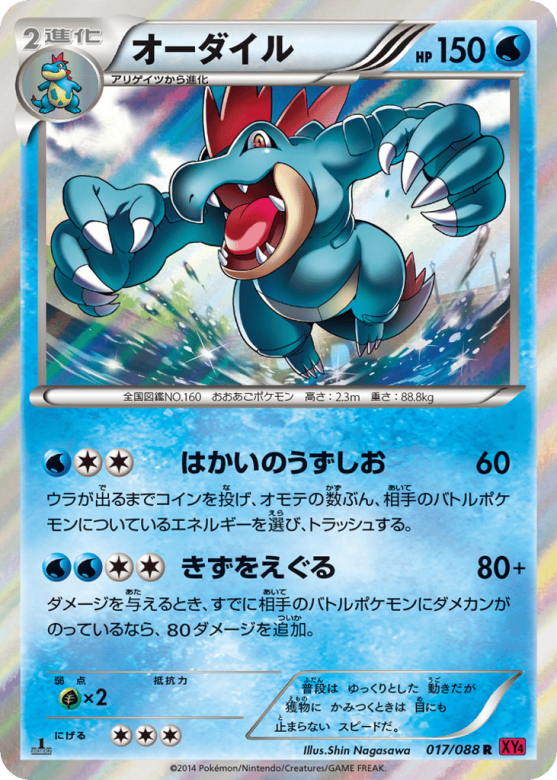 ウラが出るまでコインを投げ、オモテの数ぶん、相手のバトルポケモンについているエネルギーを選び、トラッシュする。