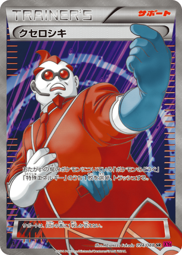 おたがいの場のポケモンについている「ポケモンのどうぐ」「特殊エネルギー」のうち1枚を選び、トラッシュする。 サポートは、自分の番に1枚しか使えない。