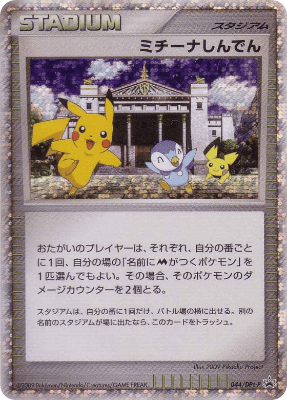 おたがいのプレイヤーは、それぞれ、自分の番ごとに1回、自分の場の「名前にMがつくポケモン」を1匹選んでもよい。その場合、そのポケモンのダメージカウンターを2個とる。 スタジアムは、自分の番に1枚だけ、バトル場の横に出せる。別の名前のスタジアムが場に出たなら、このカードをトラッシュする。