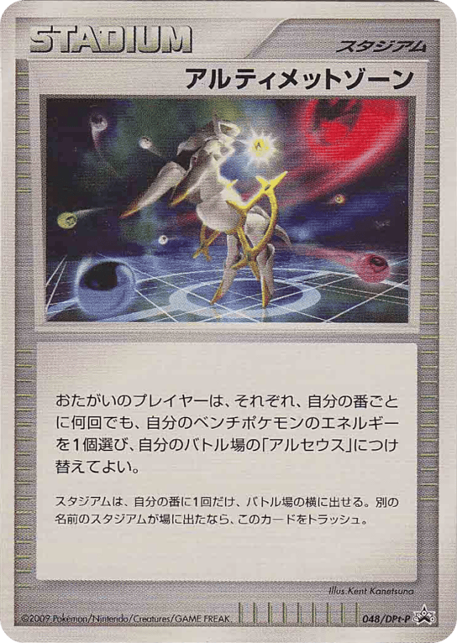 おたがいのプレイヤーは、それぞれ、自分の番ごとに何回でも、自分のベンチポケモンのエネルギーを1個選び、自分のバトル場の「アルセウス」につけ替えてよい。 スタジアムは、自分の番に1枚だけ、バトル場の横に出せる。別の名前のスタジアムが場に出たなら、このカードをトラッシュする。