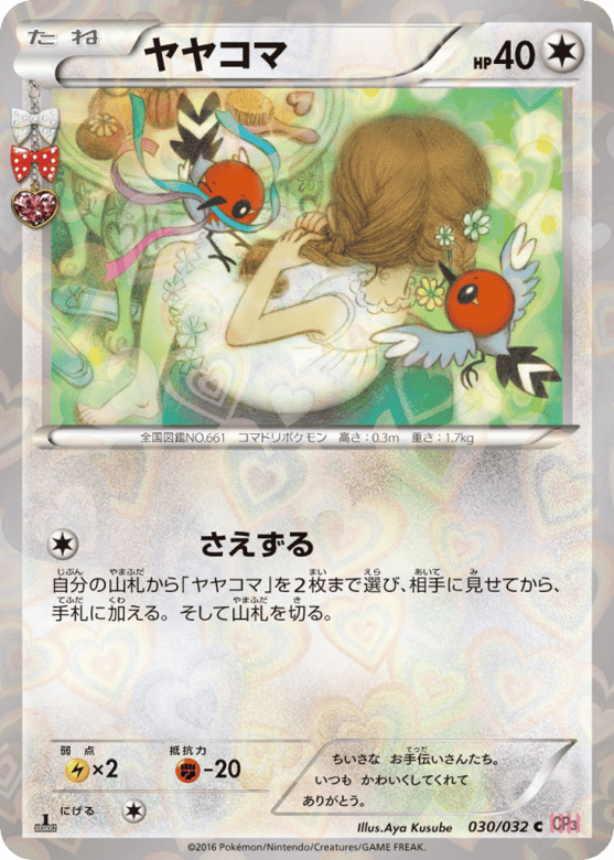 自分の山札から「ヤヤコマ」を2枚まで選び、相手に見せてから、手札に加える。そして山札を切る。