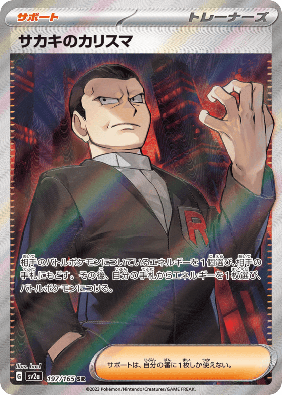 相手のバトルポケモンについているエネルギーを1個選び、相手の手札にもどす。その後、自分の手札からエネルギーを1枚選び、バトルポケモンにつける。 サポートは、自分の番に1枚しか使えない。