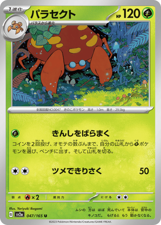 コインを2回投げ、オモテの数ぶんまで、自分の山札からGrassポケモンを選び、ベンチに出す。そして山札を切る。