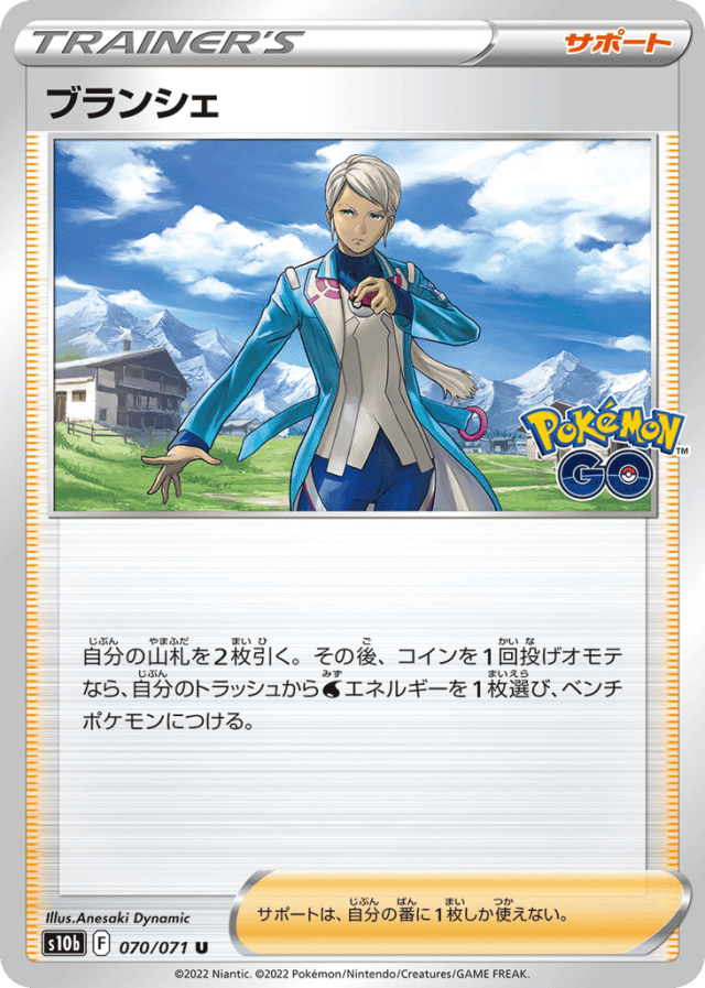 自分の山札を2枚引く。その後、コインを1回投げオモテなら、自分のトラッシュからWaterエネルギーを1枚選び、ベンチポケモンにつける。 サポートは、自分の番に1枚しか使えない。