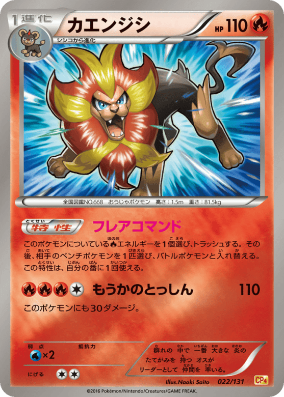 このポケモンについているFireエネルギーを1個選び、トラッシュする。その後、相手のベンチポケモンを1匹選び、バトルポケモンと入れ替える。この特性は、自分の番に1回使える。
