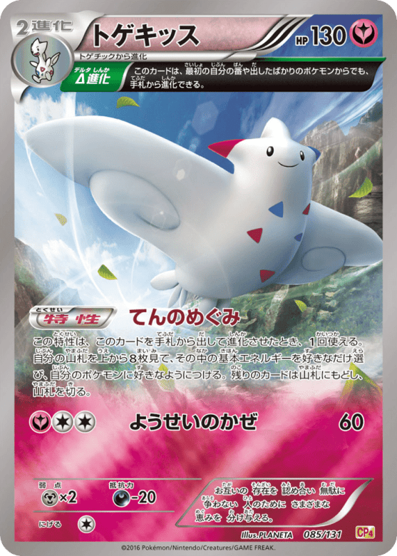 この特性は、このカードを手札から出して進化させたとき、1回使える。自分の山札を上から8枚見て、その中の基本エネルギーを好きなだけ選び、自分のポケモンに好きなようにつける。残りのカードは山札にもどし、山札を切る。