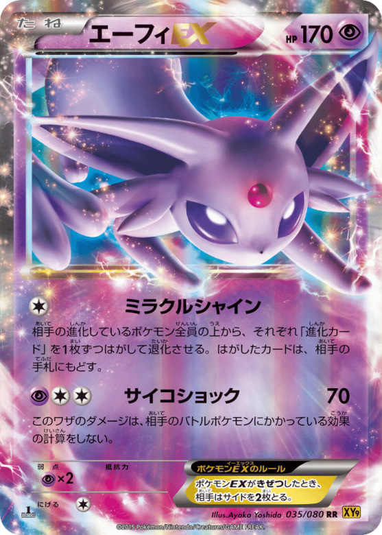 相手の進化しているポケモン全員の上から、それぞれ「進化カード」を1枚ずつはがして退化させる。はがしたカードは、相手の手札にもどす。