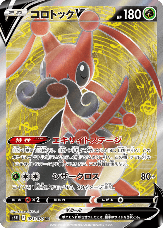 自分の番に1回使える。自分の手札が3枚になるように、山札を引く。このポケモンがバトル場にいるなら、4枚になるように引く。この番、すでに別の「エキサイトステージ」を使っていたなら、この特性は使えない。