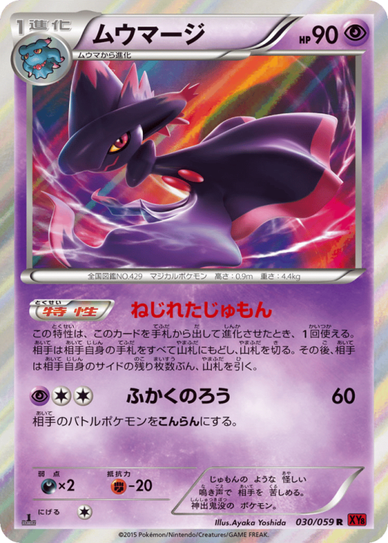 この特性は、このカードを手札から出して進化させたとき、1回使える。相手は相手自身の手札をすべて山札にもどし、山札を切る。その後、相手は相手自身のサイドの残り枚数ぶん、山札を引く。