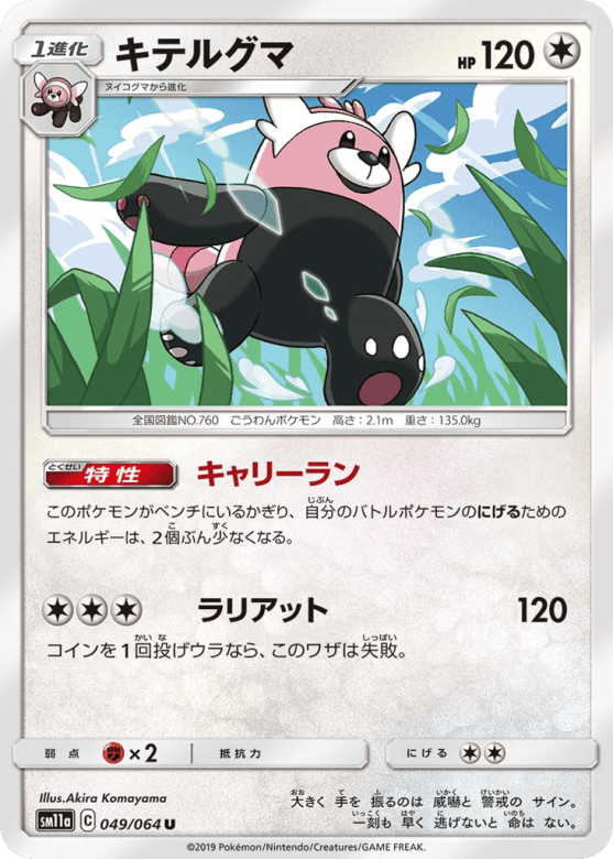 このポケモンがベンチにいるかぎり、自分のバトルポケモンのにげるためのエネルギーは、2個ぶん少なくなる。