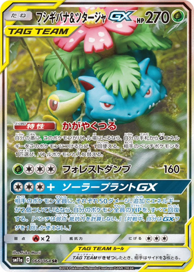 相手のポケモン全員に、それぞれ50ダメージ。追加でエネルギーが2個ついているなら、自分のポケモン全員のHPを、すべて回復する。[ベンチは弱点・抵抗力を計算しない。][対戦中、自分はGXワザを1回しか使えない。]