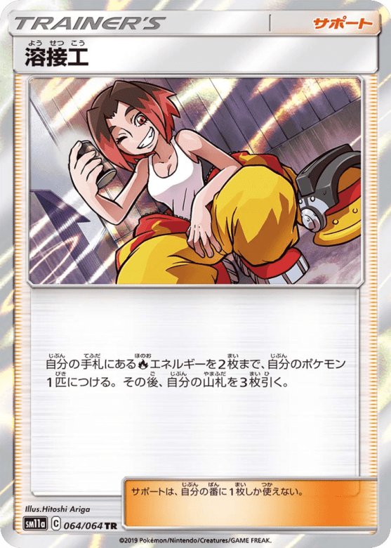 自分の手札にあるFireエネルギーを2枚まで、自分のポケモン1匹につける。その後、自分の山札を3枚引く。 サポートは、自分の番に1枚しか使えない。