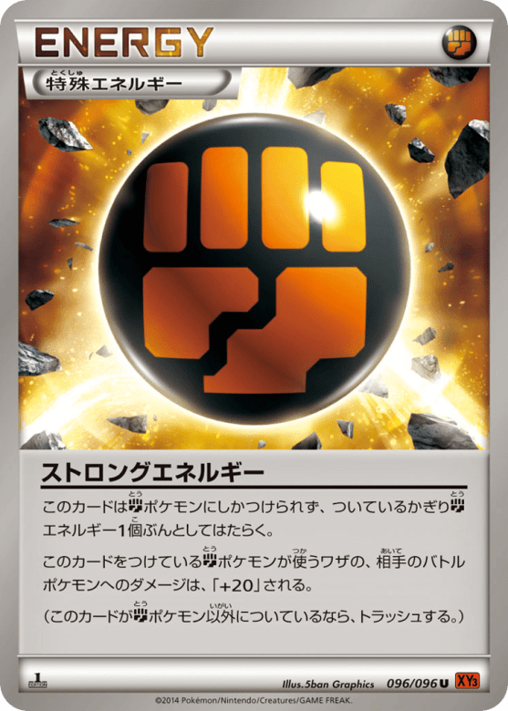 このカードはFightingエネルギー1個ぶんとしてはたらく。 このカードをつけているFightingポケモンが使うワザの、相手のバトルポケモンへのダメージは、「+20」される。 (このカードがFightingポケモン以外についているなら、トラッシュする。)