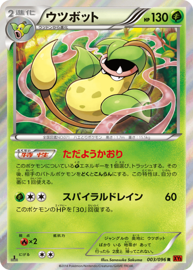 このポケモンについているGrassエネルギーを1個選び、トラッシュする。その後、相手のバトルポケモンをどくとこんらんにする。この特性は、自分の番に1回使える。