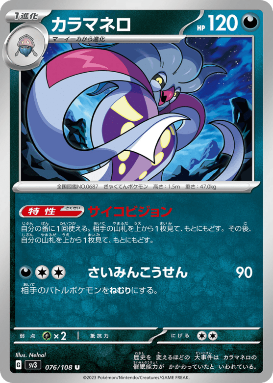 自分の番に1回使える。相手の山札を上から1枚見て、もとにもどす。その後、自分の山札を上から1枚見て、もとにもどす。