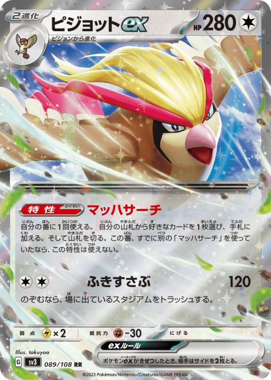 自分の番に1回使える。自分の山札から好きなカードを1枚選び、手札に加える。そして山札を切る。この番、すでに別の「マッハサーチ」を使っていたなら、この特性は使えない。
