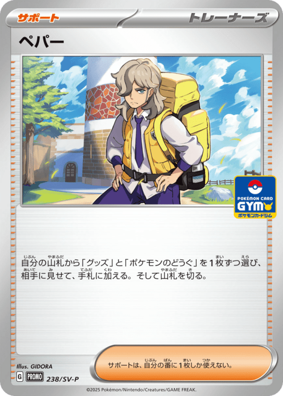 自分の山札から「グッズ」と「ポケモンのどうぐ」を1枚ずつ選び、相手に見せて、手札に加える。そして山札を切る。 サポートは、自分の番に1枚しか使えない。