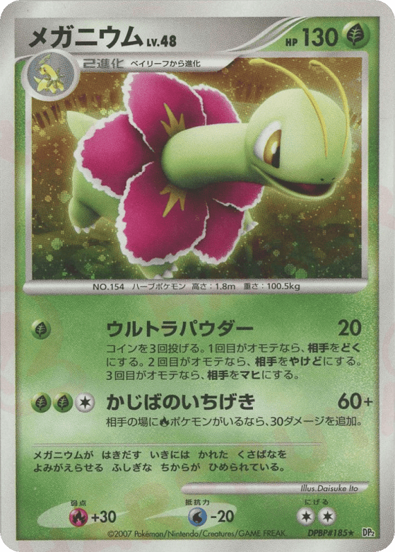 メガニウムが はきだす いきには かれた くさばなを よみがえらせる ふしぎな ちからが ひめられている。