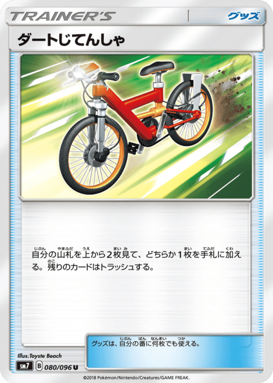 自分の山札を上から2枚見て、どちらか1枚を手札に加える。残りのカードはトラッシュする。 グッズは、自分の番に何枚でも使える。