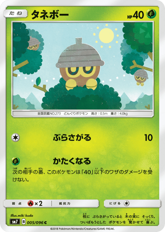 枝に ぶらさがっていると 木の実に そっくり。 ついばもうとした ポケモンを 驚かせて 喜ぶ。