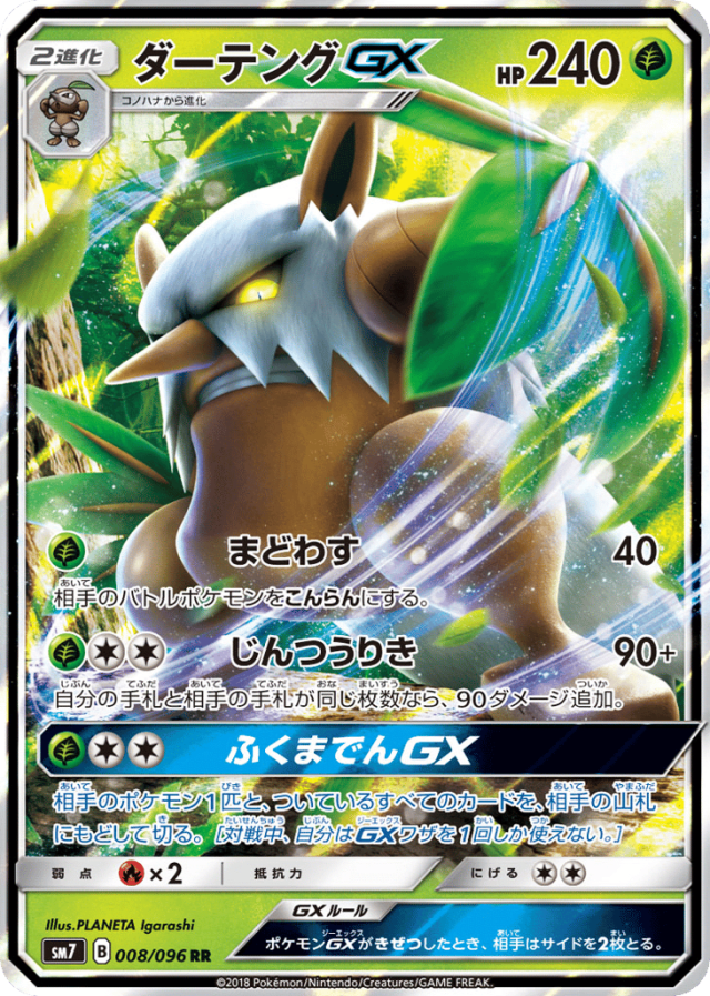 相手のポケモン1匹と、ついているすべてのカードを、相手の山札にもどして切る。[対戦中、自分はGXワザを1回しか使えない。]
