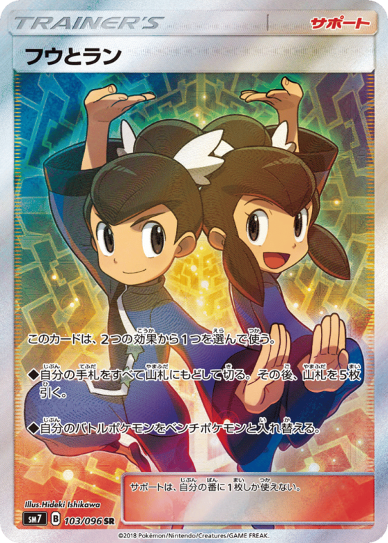 このカードは、2つの効果から1つを選んで使う。 ◆自分の手札をすべて山札にもどして切る。その後、山札を5枚引く。 ◆自分のバトルポケモンをベンチポケモンと入れ替える。 サポートは、自分の番に1枚しか使えない。