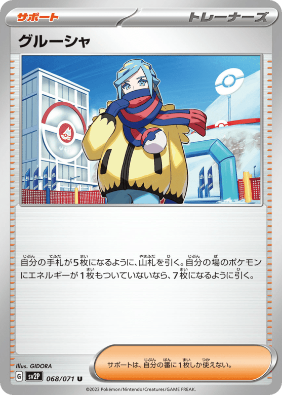 自分の手札が5枚になるように、山札を引く。自分の場のポケモンにエネルギーが1枚もついていないなら、7枚になるように引く。 サポートは、自分の番に1枚しか使えない。