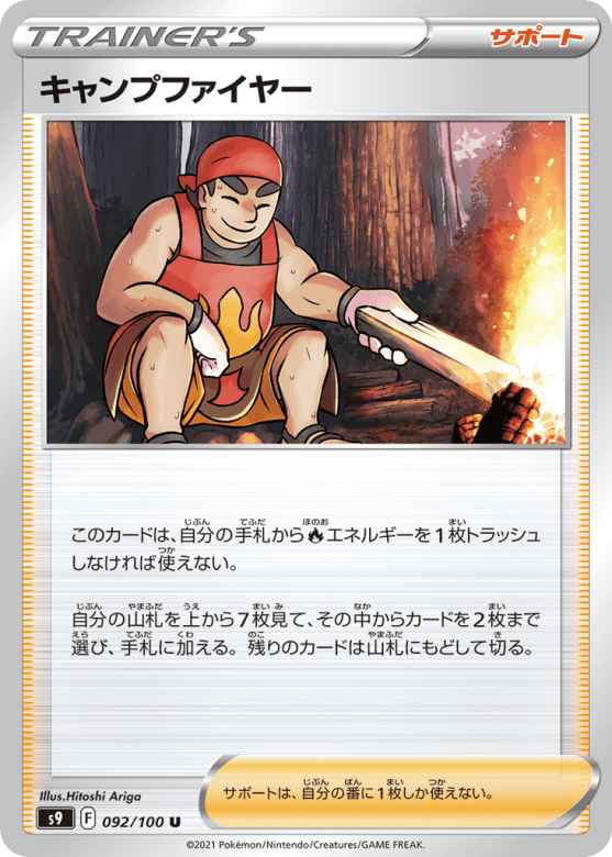 このカードは、自分の手札からFireエネルギーを1枚トラッシュしなければ使えない。 自分の山札を上から7枚見て、その中からカードを2枚まで選び、手札に加える。残りのカードは山札にもどして切る。 サポートは、自分の番に1枚しか使えない。
