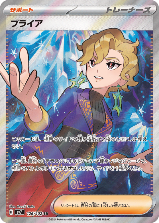 このカードは、相手のサイドの残り枚数が2枚のときにしか使えない。 この番、自分の「テラスタル」のポケモンが使うワザのダメージで、相手のバトルポケモンがきぜつしたなら、サイドを1枚多くとる。 サポートは、自分の番に1枚しか使えない。