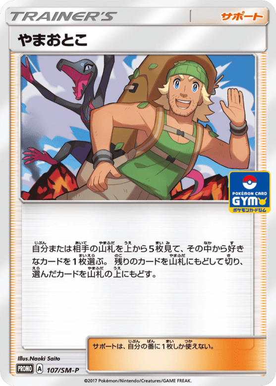 自分または相手の山札を上から5枚見て、その中から好きなカードを1枚選ぶ。残りのカードを山札にもどして切り、選んだカードを山札の上にもどす。 サポートは、自分の番に1枚しか使えない。