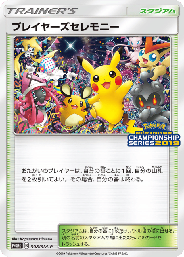 おたがいのプレイヤーは、自分の番ごとに1回、自分の山札を2枚引いてよい。その場合、自分の番は終わる。 スタジアムは、自分の番に1枚だけ、バトル場の横に出せる。別の名前のスタジアムが場に出たなら、このカードをトラッシュする。