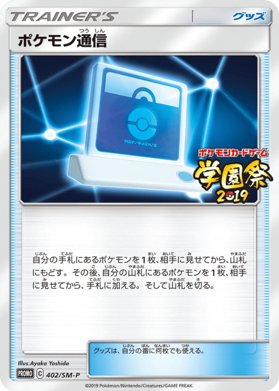 自分の手札にあるポケモンを1枚、相手に見せてから、山札にもどす。その後、自分の山札にあるポケモンを1枚、相手に見せてから、手札に加える。そして山札を切る。 グッズは、自分の番に何枚でも使える。