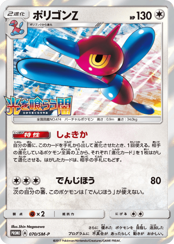 自分の番に、このカードを手札から出して進化させたとき、1回使える。相手の進化しているポケモン全員の上から、それぞれ「進化カード」を1枚はがして退化させる。はがしたカードは、相手の手札にもどす。