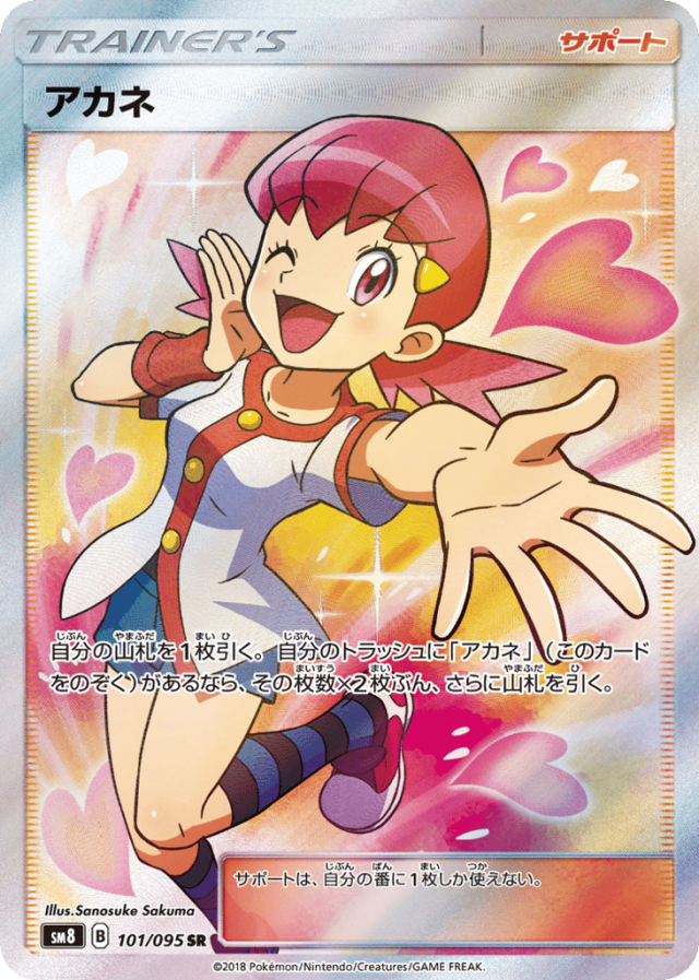 自分の山札を1枚引く。自分のトラッシュに「アカネ」(このカードをのぞく)があるなら、その枚数×2枚ぶん、さらに山札を引く。 サポートは、自分の番に1枚しか使えない。