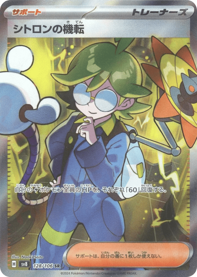 Heal 60 damage from each of your Lightning Pokémon. You may play only 1 Supporter card during your turn.