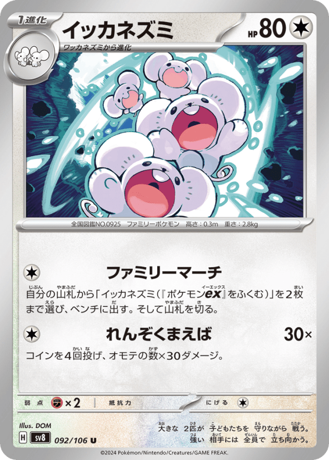 自分の山札から「イッカネズミ(『ポケモンex』をふくむ)」を2枚まで選び、ベンチに出す。そして山札を切る。