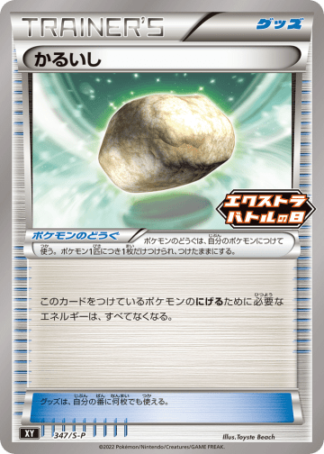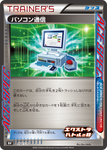 自分の山札にある「スタジアム」を1枚、相手に見せてから、手札に加える。そして山札を切る。 追加で、このカードを使うときに、自分の手札を2枚トラッシュしてよい。その場合、「ポケモンのどうぐ」と「特殊エネルギー」も1枚ずつ手札に加えられる。 サポートは、自分の番に1枚しか使えない。