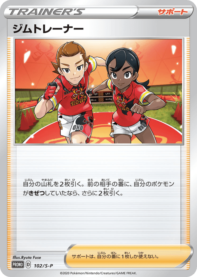 自分の山札を2枚引く。前の相手の番に、自分のポケモンがきぜつしていたなら、さらに2枚引く。 サポートは、自分の番に1枚しか使えない。